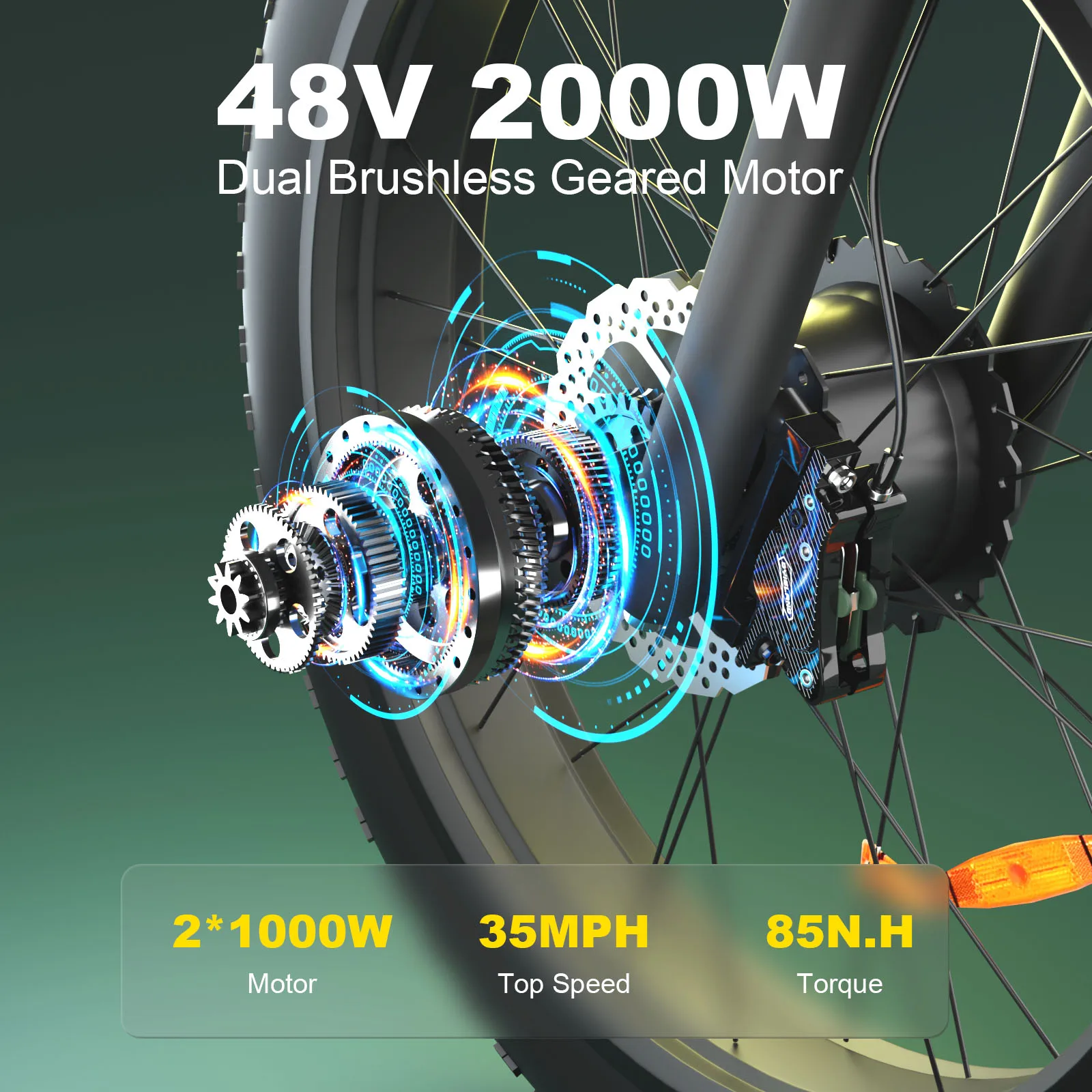 • Powerful Dual Motor AWD: Experience thrilling speeds up to 35MPH with a robust 2000W system and 165NM torque, tackling any terrain with ease.